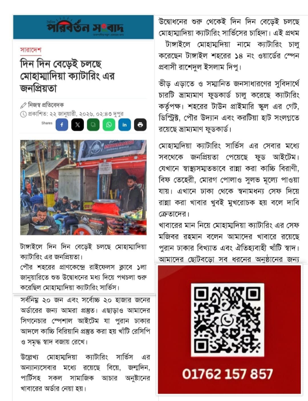 মোহাম্মদিয়া ক্যাটারিং সার্ভিস টাঙ্গাইলের একটি সুপরিচিত নাম। আমরা দীর্ঘদিন ধরে পুরান ঢাকা স্টাইলের ঐতিহ্যবাহী খাবার ও ক্যাটারিং সার্ভিস দিয়ে আসছি। প্রতিটি খাবার প্রস্তুত করা হয় অভিজ্ঞ বাবুর্চির হাতে ও স্বাস্থ্যসম্মত পরিবেশে।